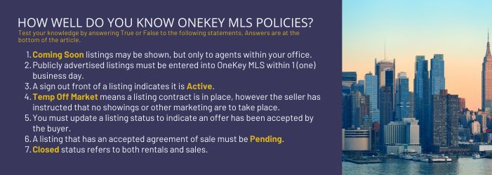 - Ensuring you know and abide by the requirement to submit listings and NAR's Clear Cooperation. As a OneKey® MLS subscriber, you agree to abide by NAR’s Clear Cooperation policy. Listing agents must enter all listings within the OneKey® MLS footprint within one (1) business day of marketing to the public. If instructed by your seller not to market in the MLS, you must fill out an Office Exclusive Form and have it signed by your seller. The listing is entered in the MLS asPrivate - Y.Learn more about theClear Cooperationand the recently announcedMultiple Listing Options for Sellers.